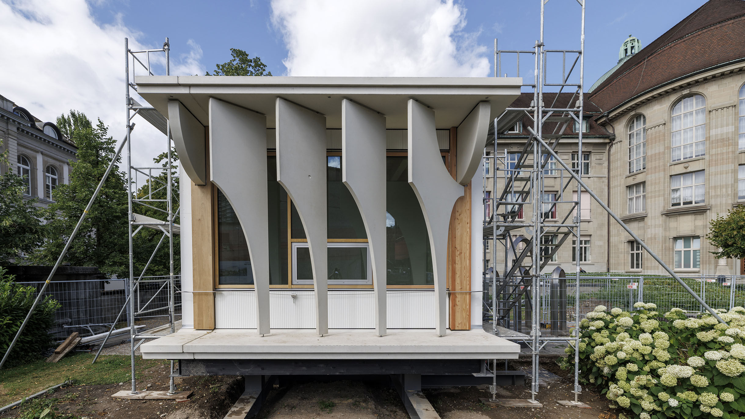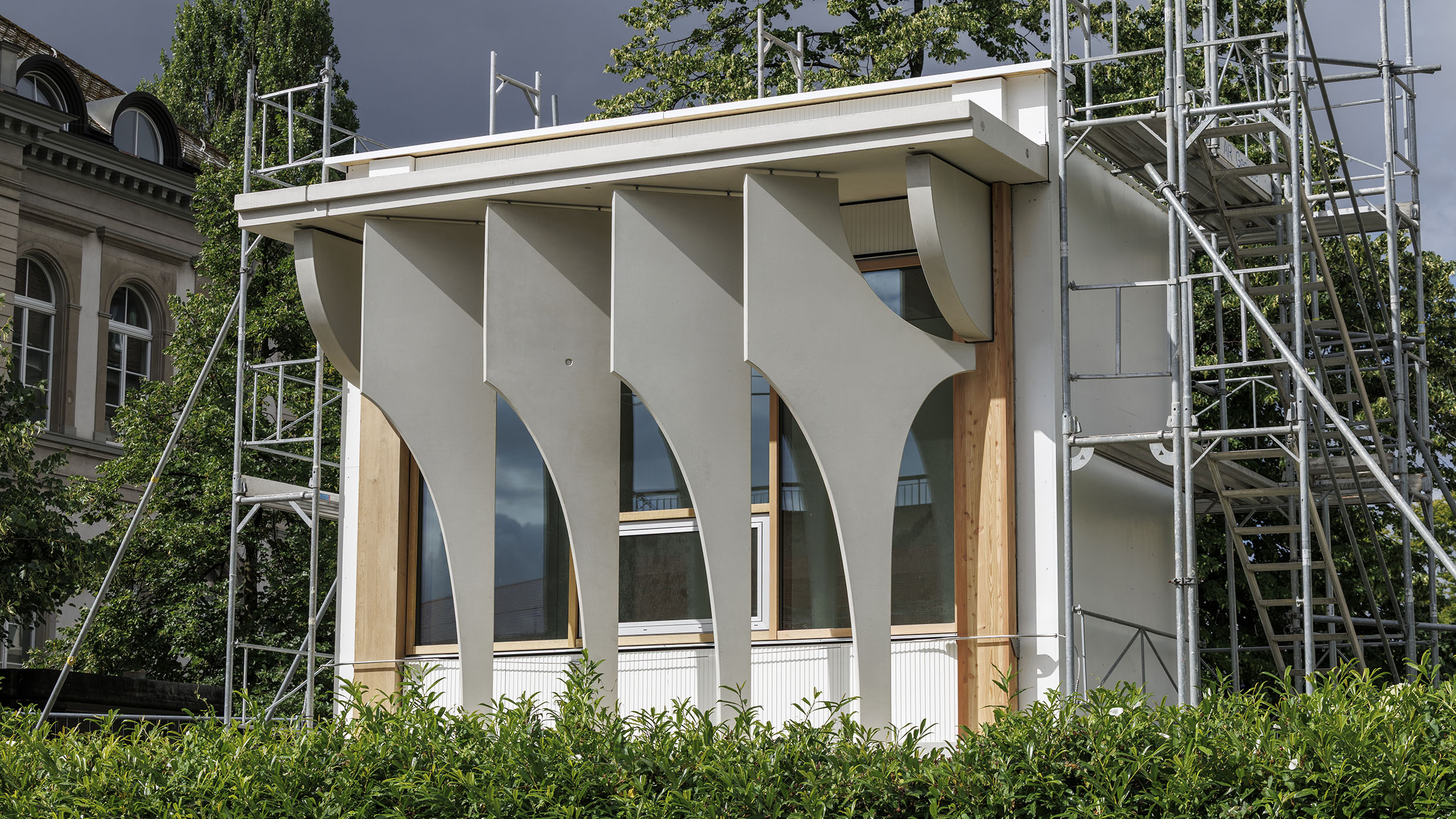 Nun steht es im Garten des Kollegiengebäudes – gut sichtbar für ca. drei Jahre. Wie wirkt die künftige Fassade im Morgenlicht? Was passiert mit Licht und Schatten, wenn die Sonne wandert? Wie verändert sich die Wahrnehmung je nach Blickwinkel? Der Prototyp im Originalmassstab zeigt einen Ausschnitt der Fassade inklusive der sogenannten «Brise-Soleil» – jenen markanten Sonnenschutzelementen, die das neue FORUM UZH prägen werden. Die fest installierten Verschattungselemente reduzieren die Erwärmung der Fassade. Gleichzeitig reflektieren die hellen Oberflächen das Tageslicht und lenken es in die Innenräume.